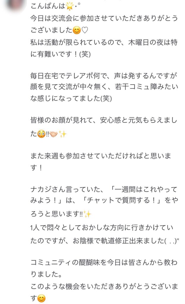 「今回参加してみなさんと近くなった気がします🥰楽しかったです😃コミュニティの醍醐味を経験させていただきました!また参加させていただきます🥰」