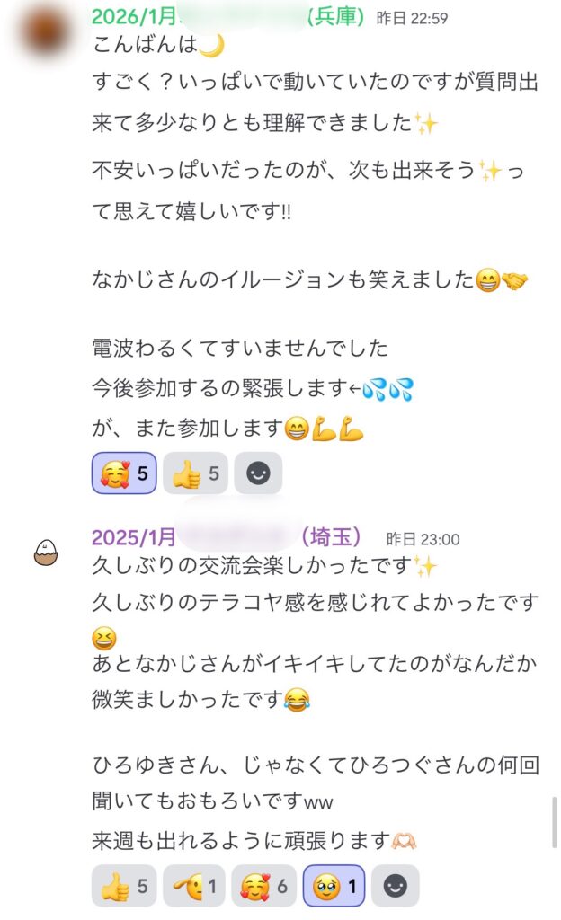 「とても楽しく、学びもあり、どんな方が参加しているか、実際にお顔をみれて良かったです😊」