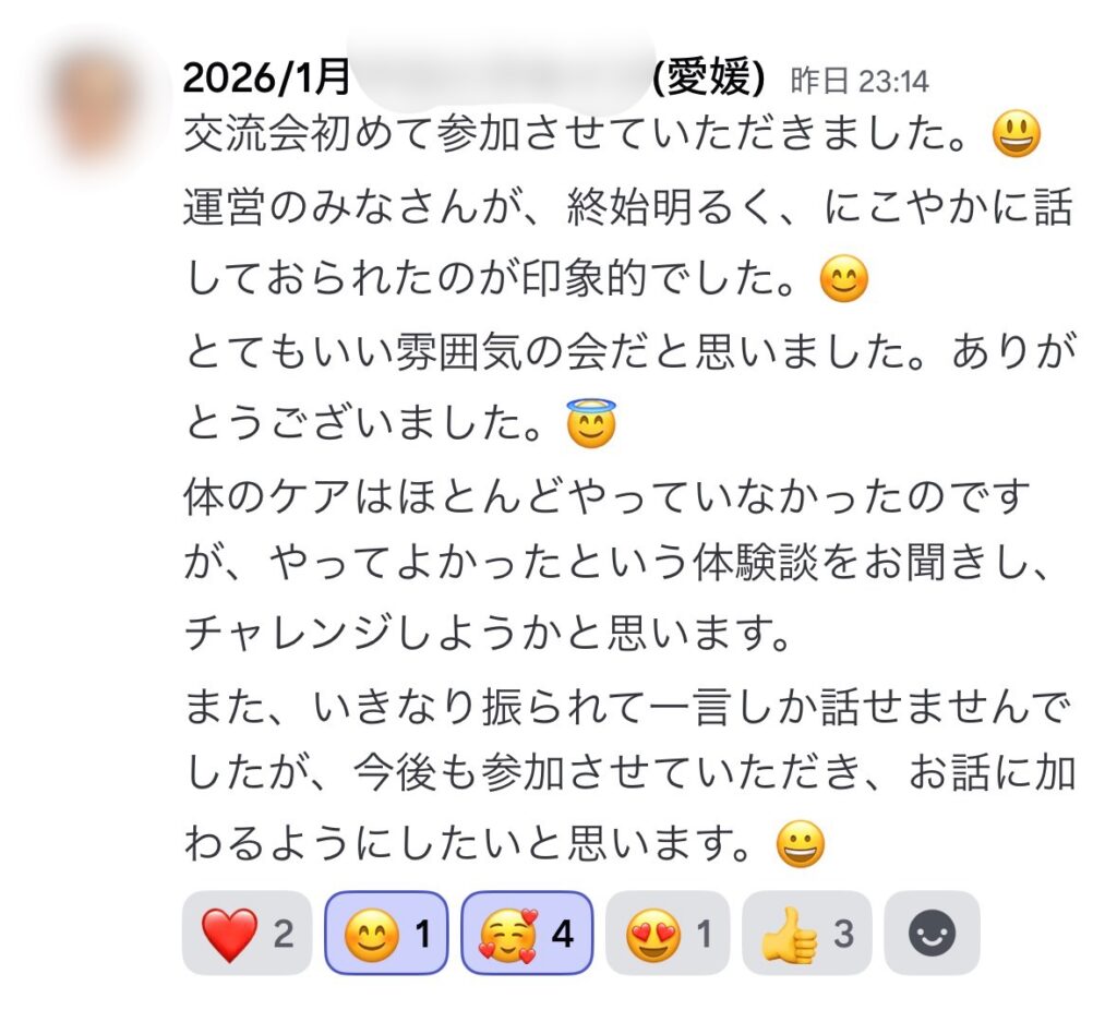 「運営のみなさんが、終始明るく、にこやかに話しておられたのが印象的でした。😊とてもいい雰囲気の会だと思いました。ありがとうございました。😇」
